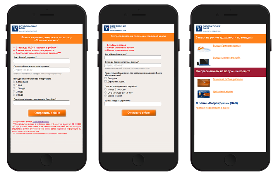 С целью увеличения интереса и роста продаж определенных продуктов Банка «Возрождение», было принято решение о создании мобильного решения для привлечения уже существующих и потенциальных клиентов. Перед нами стояла задача внедрить в мобильный сайт онлайн анкеты, на которые пользователи будут попадать после проведенных банком SMS-рассылок.